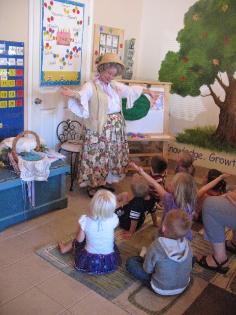 We’re always happy when Mother Goose flies in for a visit! The kids always enjoy her rhymes, stories, and songs! She comes once a month to all our classes! We sure love Mother Goose!