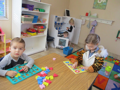 Playing together during centers! I love seeing how creative the children are as they play individually and with their classmates. Check out the animals all fed and cared for, the little mother reading to her child, and the two boys in the back playing store together! What fun times!