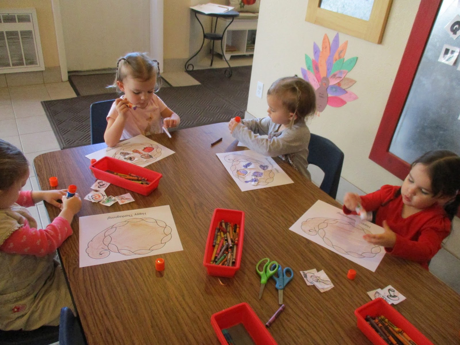 Happy Thanksgiving! I hope you each had a lovely Thanksgiving! The children each made a couple of turkey feathers and put what they are thankful for. Then, each class made a Thankful Turkey to display! Here are a few of the finished works!