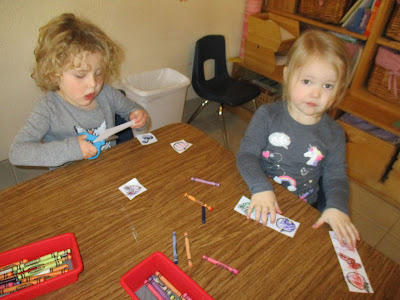 As we learned about Thanksgiving, we made cornucopias which we talked about are a symbol of a good harvest and many blessings. The children practiced cutting out the fruit and vegetable shapes. Their cutting skills are coming along! Even the 3-year-olds did a little cutting!