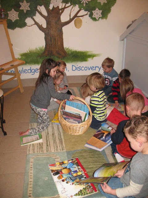 A basket full of Christmas books to look at after snack time!