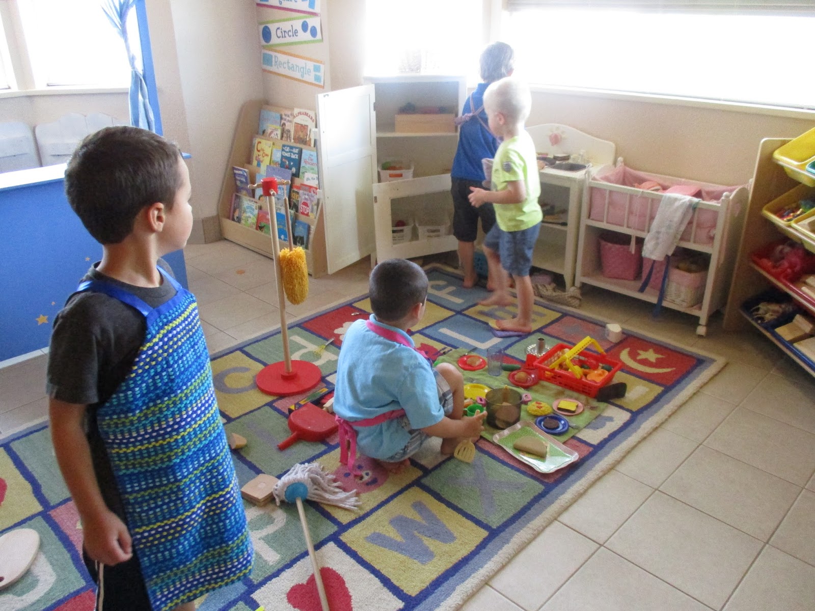 I love our kitchen and cleaning center. Many days, the boys are just as interested in it as the girls! They love to pretend to clean and cook and have picnics too!