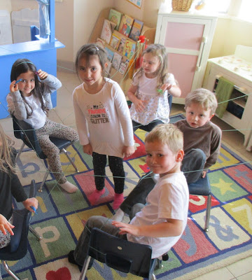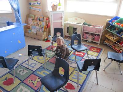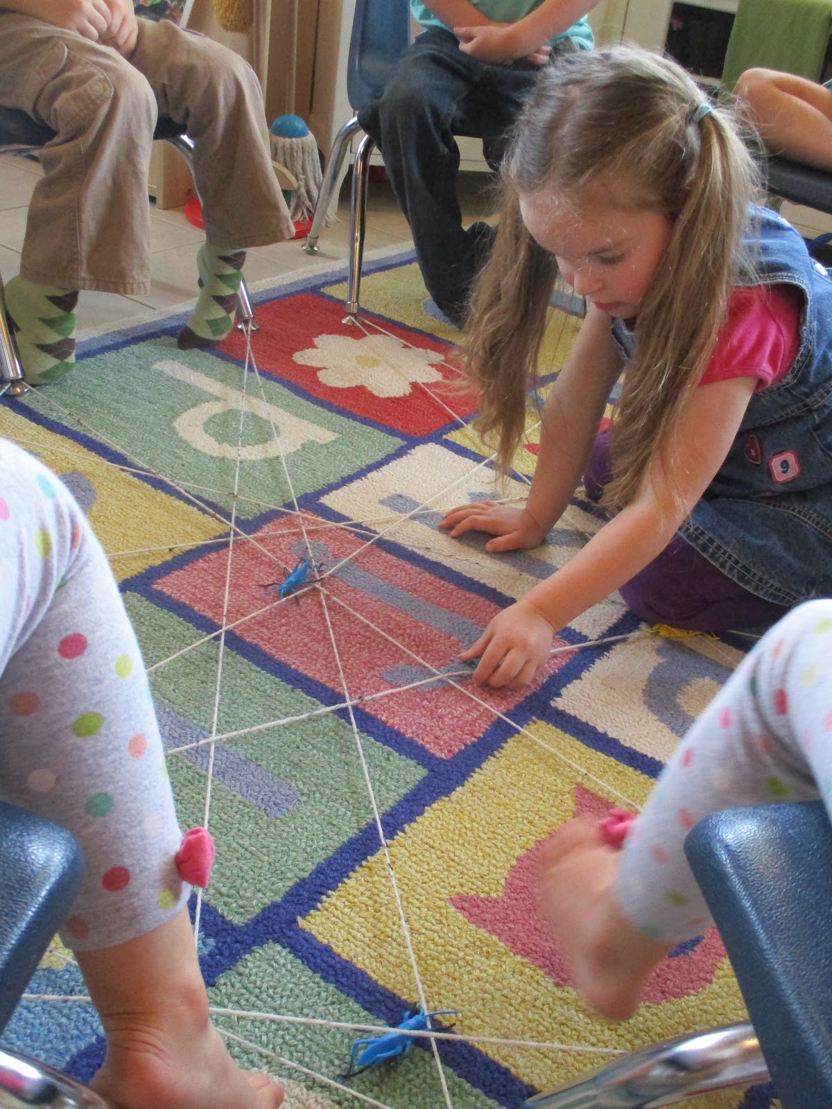 After we learned that spiders use their webs to catch their food, we made a class-sized spider web and filled it with insects. The kids took turns walking their spider along the web and catching its’ prey.