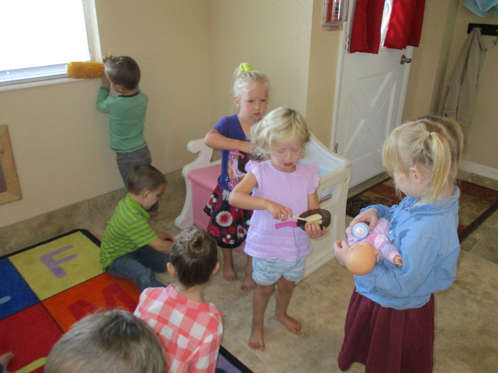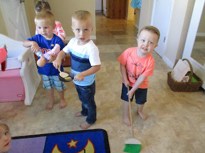 Since all of our preschoolers are so big now, we talked about many ways they can help in their homes and families. They loved taking turns doing each little job as we sang a song about helping our families. They helped take care of babies, swept, mopped, dusted, picked up toys, stirred and helped cook to name a few of the ways they helped!
