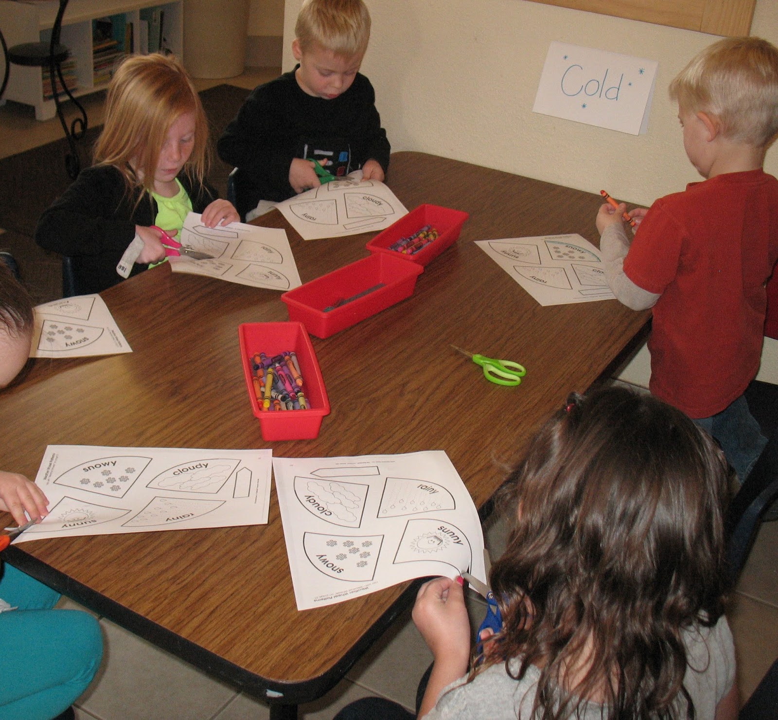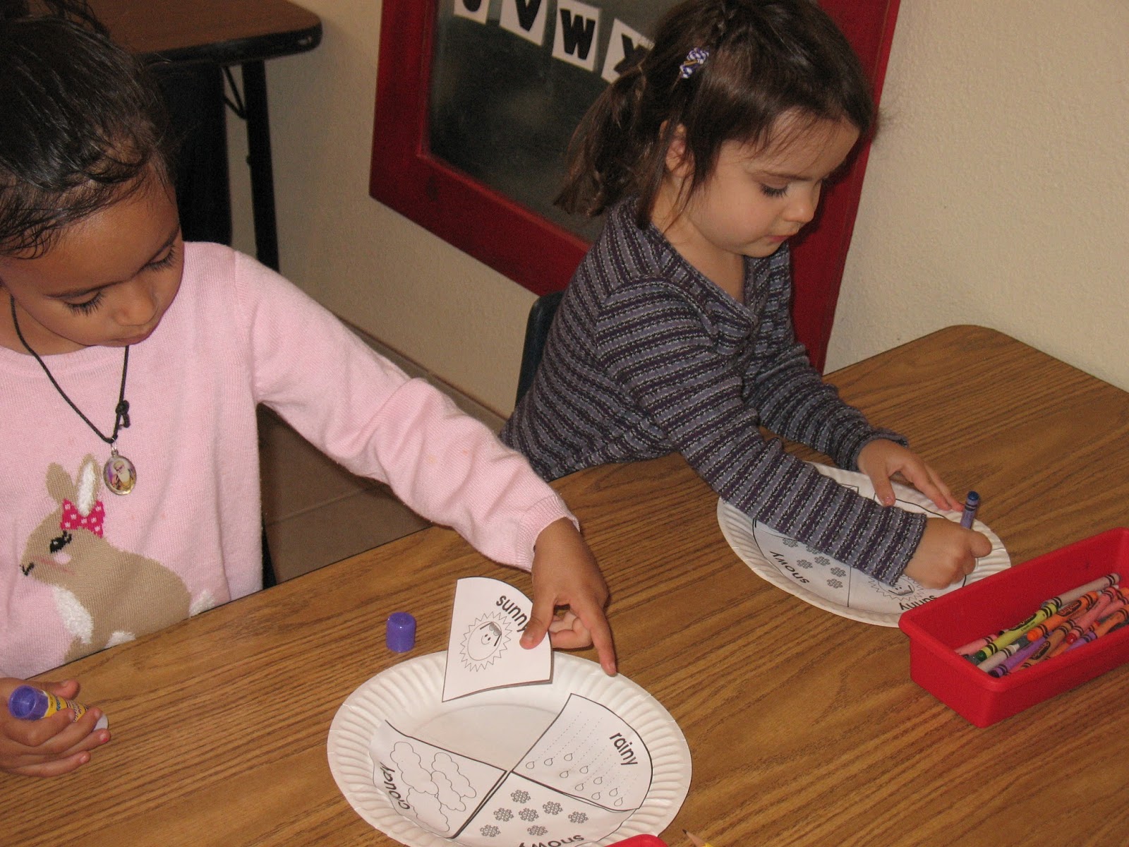 Then we made a weather chart that the kids could take home to share with their family what type of weather they observe each day. This was a great project for the Pre-K kids to practice their cutting skills. They did a great job! All the students were very interested in learning about the weather. Every time we went out to recess, we looked up at the sky and noticed what the weather was like. They were so intrigued! We will continue to notice how the weather changes as we transition into winter!