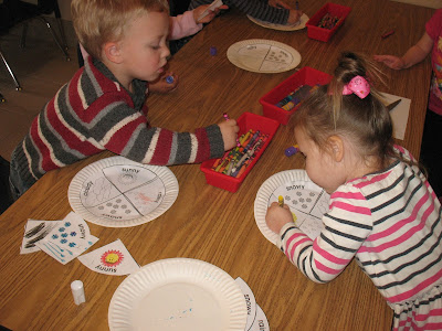 During November we are learning about weather! We talked about sunny, cloudy, partly cloudy, windy, rainy, and snowy. Here we were making a sun for sunny weather.